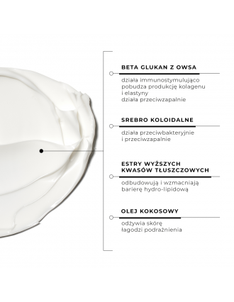 B-Gluc+cAg recovery balm is a revitalising and intensively moisturising active treatment for dry, dehydrated and sensitive skin. A complex of active ingredients, including oat beta-glucan, colloidal silver, and Omega acids 3,6,9, stimulates the cell metabolism cycle and collagen and elastin production, responsible for skin suppleness and elasticity. The balm rebuilds the hydrolipid mantle, soothes irritations, and profoundly and long-lasting moisturises, restoring a sense of comfort to the skin. It revitalises, thickens the skin, and improves its tension and elasticity. It has a pleasant natural fragrance and an essential texture. It is quickly absorbed, leaving a thin, protective film on the skin.