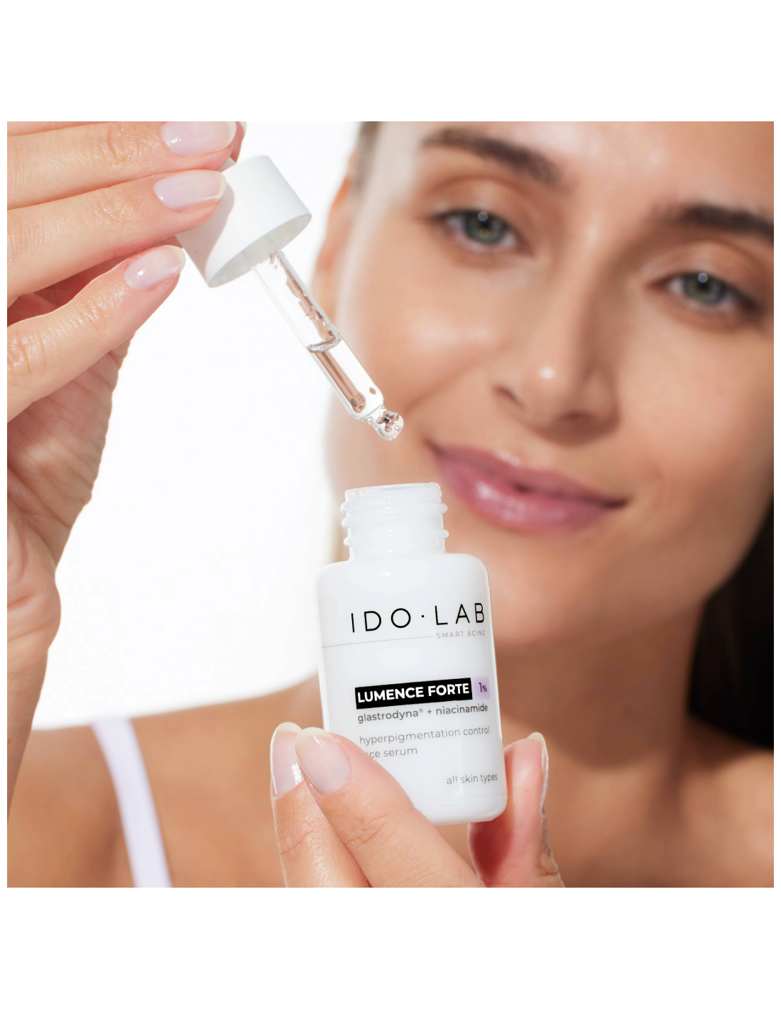 LUMENCE FORTE is an advanced serum that reduces hyperpigmentation and enhances skin radiance. The formula infused with bis-hydroxybenzyl sulfide ( glastrodina) and niacinamide reduces hyperpigmentation by inhibiting melanin production and transfer, effectively targeting dark spots, age spots, and post-inflammatory discolouration. The serum brightens the complexion, diminishing discolouration for a more even, luminous skin tone; with its antioxidant and anti-inflammatory properties, this serum reduces dark spots and prevents new pigmentation, leaving your skin revitalized, glowing, and resilient.
