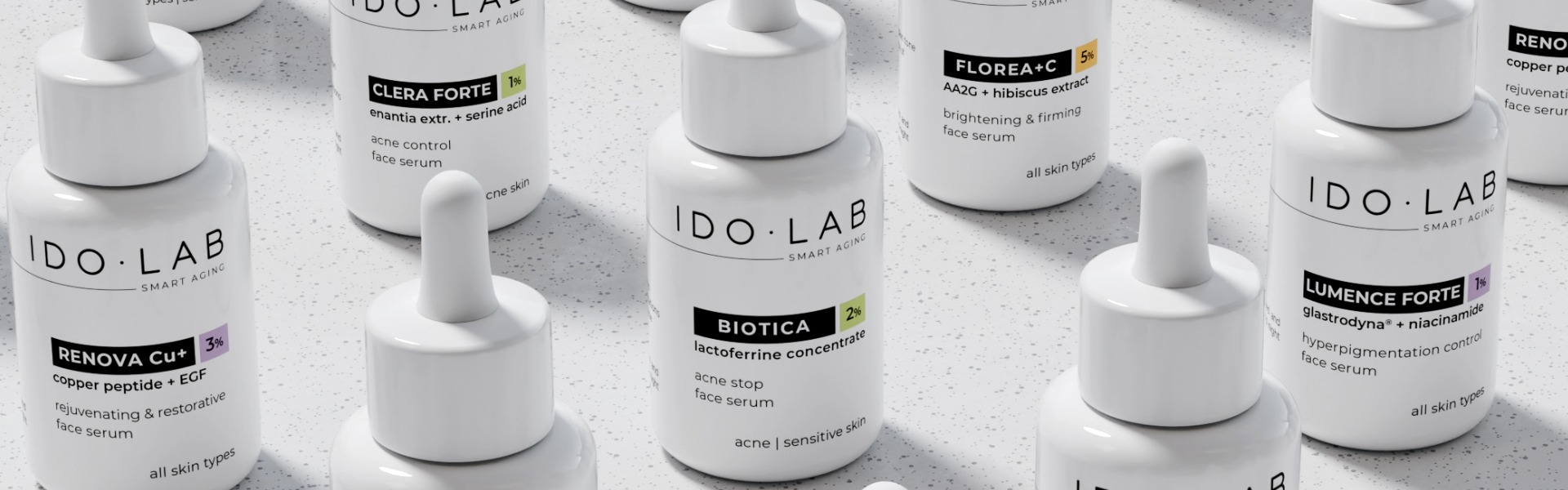 Portfolio IDO LAB obejmuje specjalistyczne sera dostosowane do różnych potrzeb skóry, pozwalając na wybór produktu odpowiadającego konkretnym problemom cery. Dojrzała skóra z oznakami starzenia, takimi jak zmarszczki czy utrata jędrności, skorzysta z serum Renova Cu+, które zawiera peptyd miedziowy GHK-Cu w stężeniu 0,5%, EGF oraz aminokwasy. Składniki te silnie stymulują produkcję kolagenu i elastyny, poprawiając gęstość i elastyczność skóry. Po 30 dniach stosowania odnotowano wzrost nawilżenia o 15%, poprawę jędrności o 7% oraz spłycenie zmarszczek o 5–11%. Skóra zyskuje bardziej sprężysty i gładki wygląd.