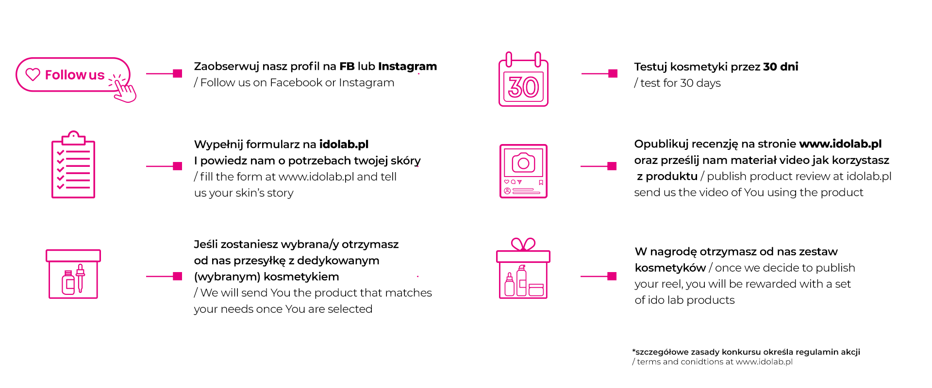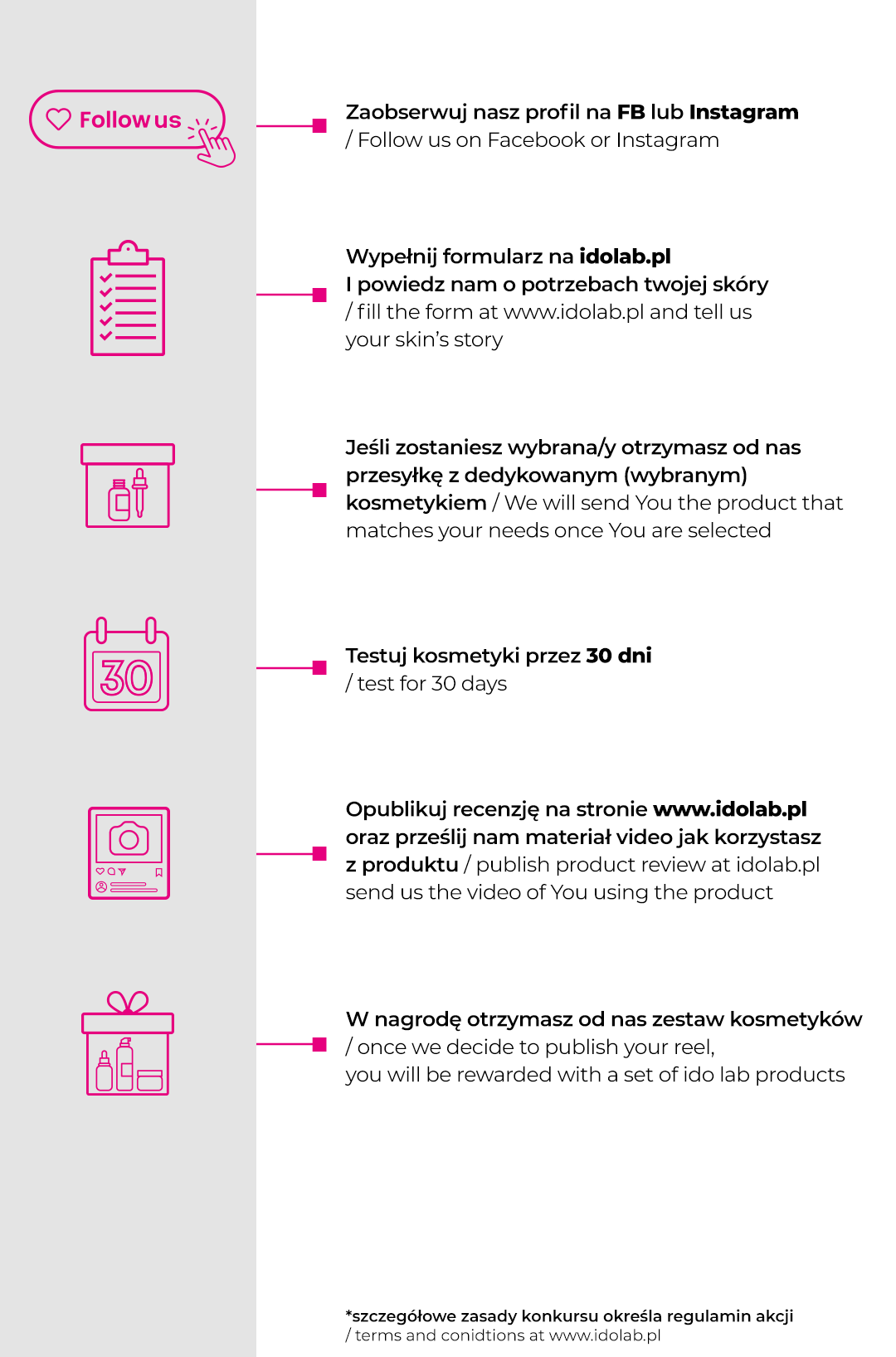 Akcja polega na testowaniu przez wybrane osoby produktów IDOLAB w zamian za publikację treści zawierających oceny tych produktów na stronie internetowej organizatora oraz dostarczenie Organizatorowi materiałów w postaci filmów -recenzji lub ich publikacji w mediach społecznościowych Uczestnika.